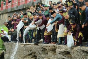 Setelah apel, kegiatan dilanjutkan dengan pelepasan benih ikan ke Sungai Batang Kuantan oleh Gubernur Riau bersama Kapolda dan Pangdam sebagai bentuk komitmen terhadap pelestarian ekosistem sungai.